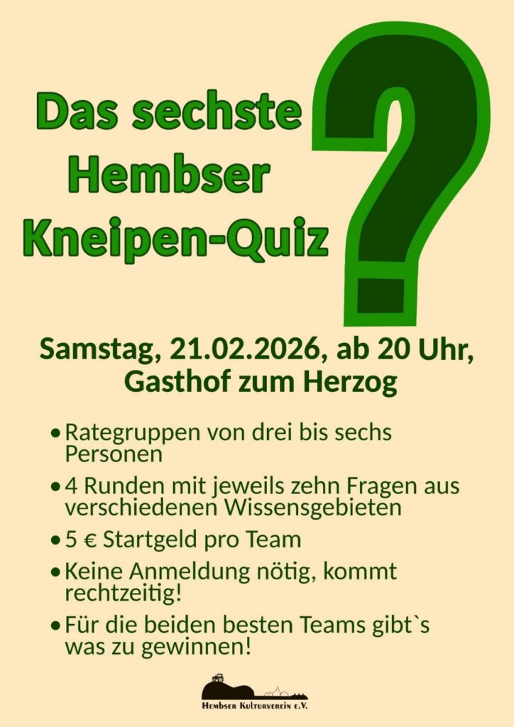 Samstag 21. Februar 2026 ab 18 Uhr Jahreshauptversammlung und anschl. ab 20 Uhr Kneipenquiz in der Gaststätte „Zum Herzog“ in der Bornstraße.